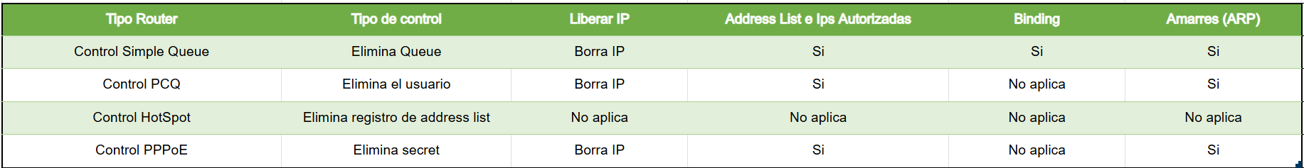 Es decir, va a borrar el registro del cliente de tu cuenta y luego va a conectar a tu RouterBoard y va a eliminar el cliente también, ya sea que este por: Simple Queues, PCQ + Address List, PPoE, HotsPot.