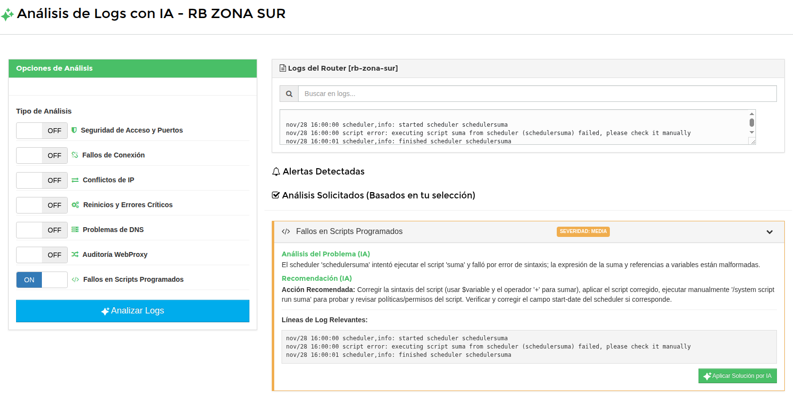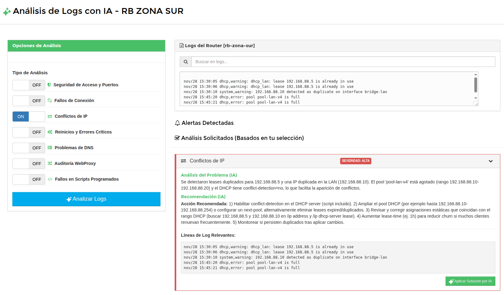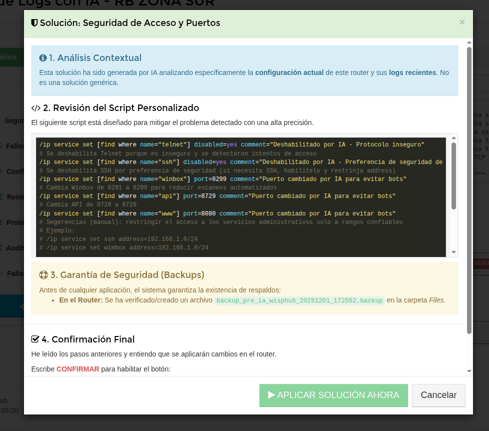 Ahora en WispHub es posible hacer que la Inteligencia Artificial análice los logs y configuración de su MikroTik para detectar problemas con Accesos y Puertos, Conflictos de IP, Problemas de DNS, entre otros.