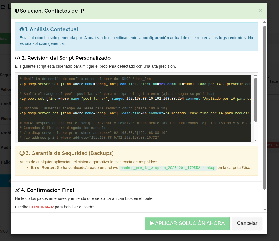 Si uno de los análisis devuelto involucra ejecutar un script en su router y usted desea aplicarlo, de clic en Aplicar solución de IA para iniciar el proceso de aplicar solución.