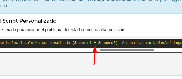 este es un ejemplo sencillo en que no se logro ejecutar un script de una suma porque el operador de suma era un ? en lugar de +, la IA ya con logs y en su catalogo de errores busca en configuracion el script para que asi detecte la falla de este, la solucioon que propone es buscar el script y en source dar el nuevo script corregido.