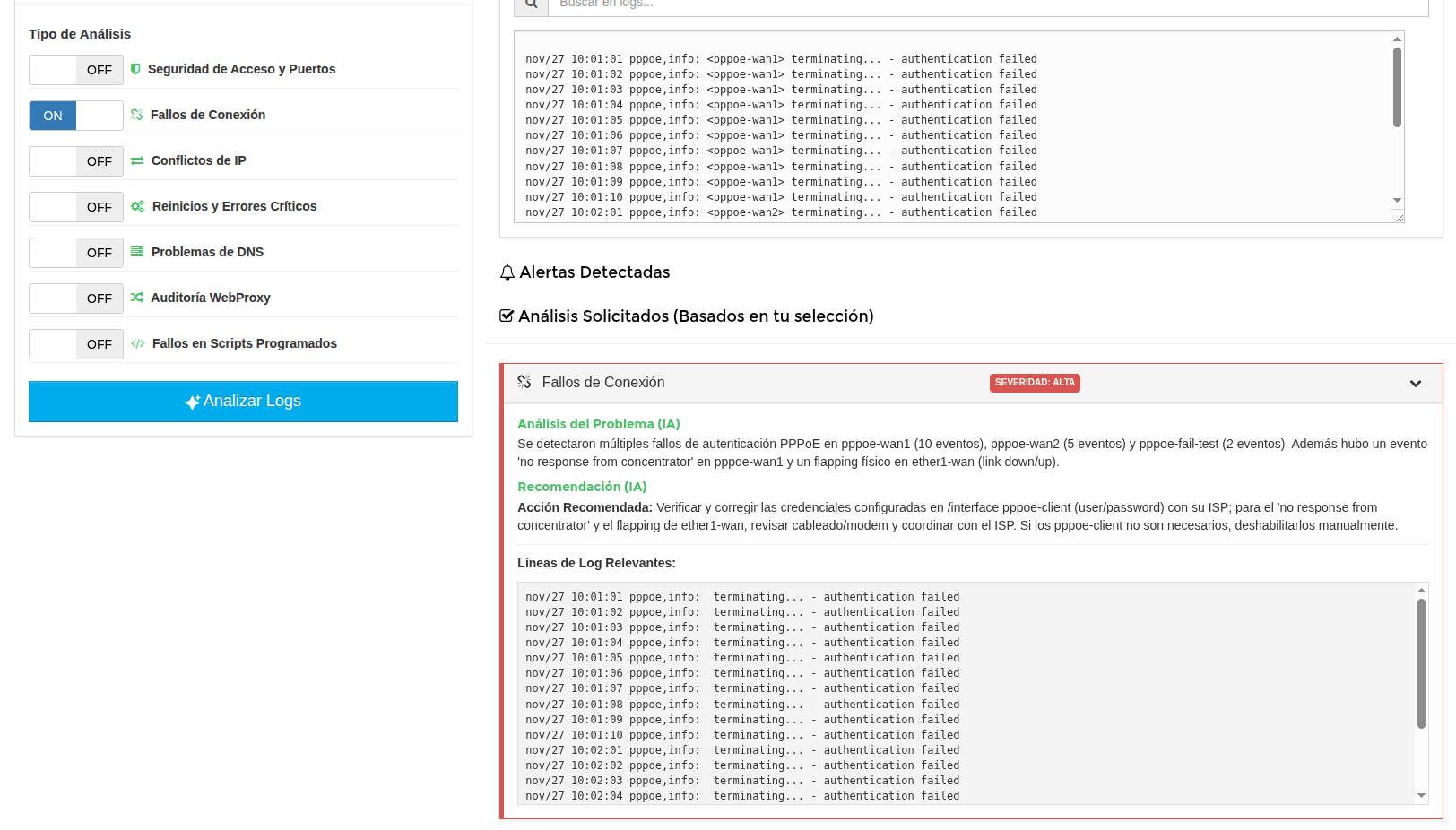 Del lado izquierdo, tiene a su disposición una lista de opciones de análisis que nuestro agente de I.A. puede detectar en su configuración y logs. Puede decidir que tipos de análisis desea realizar. Una vez desea que análisis realizar, de clic en IA - Analizar Logs. Esto iniciará el análisis y tendra que esperar a que nuestro agente le arroje los resultados