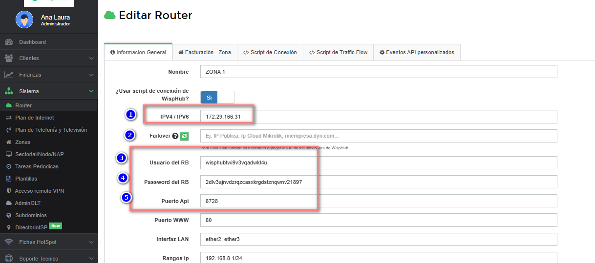 Debemos ir a SISTEMA--ROUTER y editar siempre la zona que sea principal. Si en dado caso, no conocemos cuál sea. En el mikrotik se puede verificar por el usuario