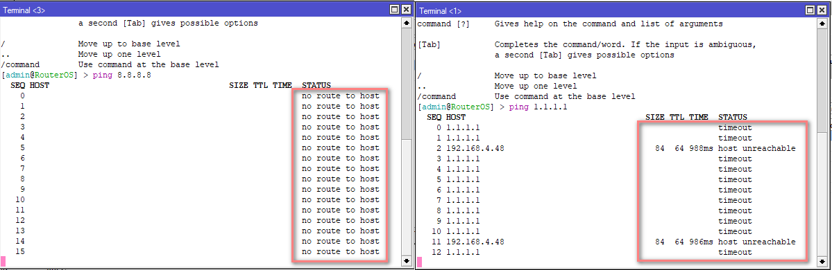 Si al hacer ping obtenemos un "TIME OUT", "NO ROUTE TO HOST" debemos corroborar nuestra configuración del rb.